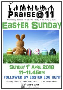 11:00am Praise@11 all-age service for Easter day, followed by an Easter egg hunt.