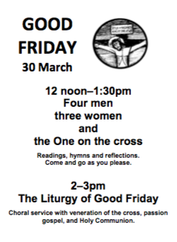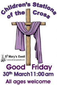 Good Friday is on 30 March. Our children’s stations of the cross is at 11am, and will be outside the church if fine. This is always a very popular children’s service that helps all ages to understand what Good Friday is about. From 12noon till 1:30pm, there will be readings, music, hymns, and reflections- please feel free to attend for part or all of this time. The choral liturgy of Good Friday starts at 2pm, with veneration of the cross and communion from the reserved sacrament. It ends at 3pm, the time Jesus died on the cross.